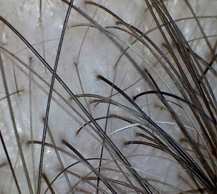 Fotos con microscopio : Imágenes clásicas de alopecia androgénica, mostrando progresiva miniaturización del pelo y pelos en diferentes fases evolutivas.